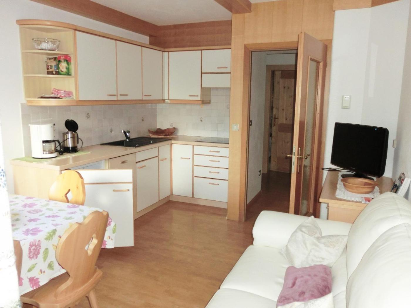 Appartamento con 1 Camera da Letto. Appartamento con balcone con vista sul Monte Kreuzkofel, 1 camera da letto e angolo cottura completamente attrezzato. A vostra disposizione anche un bagno privato con bidè e vasca o doccia. ;